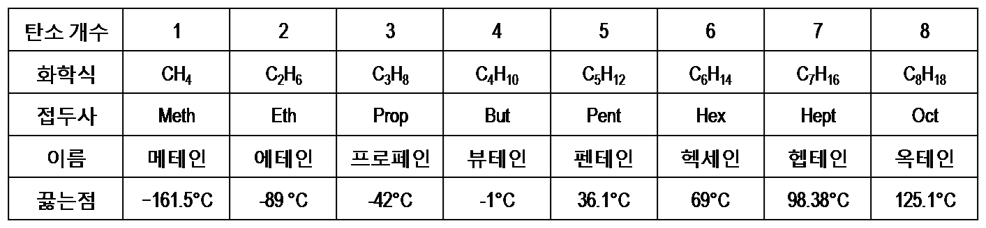 아래의 표는 단일결합으로 연결된 포화탄화수소인 알케인(Alkane, 알칸)의 탄소수에 따른 분자식과 이름을 나타낸 것입니다.