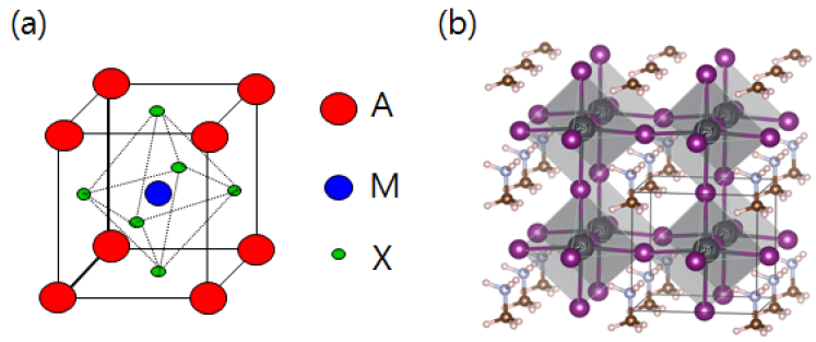 최근 태양전지의 광흡수용 소재로서 많은 주목을 받고 있는 페로브스카이트 물질은 양이온 자리인 A에 메틸암모늄(CH3NH3+)과 같은 유기물 양이온이, 양이온 자리인 B에는 납(Pb2+)과 같은 금속 양이온이, 음이온 자리인 X에는 염소(Cl-) 또는 요오드(I-)와 같은 할로겐 음이온이 포함되어 있는 3차원 페로브스카이트 구조를 가집니다. A와 B, X의 조합에 따라 다양한 종류의 유기금속할로겐 페로브스카이트 물질이 존재할 수 있으나, 주로 Methylammonium lead iodide (MAPbI3, CH3NH3PbI3)와 Formamidinium lead iodide (HC(NH2)2PbI3, FAPbI3) 두 물질이 태양전지용 페로브트카이트 소재로써 활발히 연구되고 있습니다.