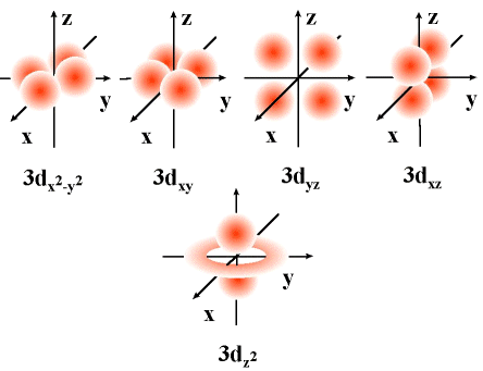 d 오비탈은 주양자수 n=3 이상인 경우에 존재하는 오비탈로, 방위양자수 l=2입니다. 주양자수 n = 3, l = 2인 경우 에서 자기양자수 m = +2, +1, 0, -1 및 -2에 해당하는 총 5개의 d 오비탈이 존재할 수 있습니다. 각 오비탈은 xyz 직교과표계에 대해 xy, yz, zx, x2-y2, z2로 표현할 수 있는제 이 오비탈의 모양은 다음과 같습니다.