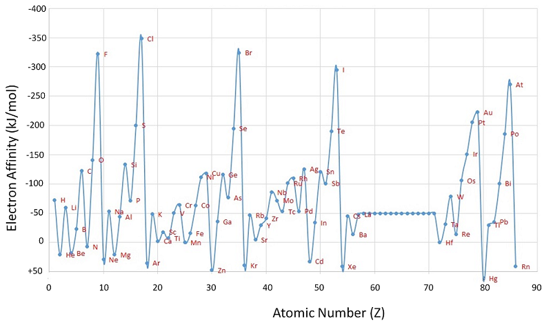 비금속은 전자를 얻음으로써 음이온을 형성하여 완전히 안정적인 옥텟을 갖기 쉽습니다. 따라서 전자를 얻어 음이온을 형성하며 에너지를 방출합니다. 따라서 비금속의 제 1 전자 친화도는 음의 부호이며 그 크기는 금속의 1차 전자 친화도보다 큽니다. 참고로 Cl(염소)의 전자친화도는 -349 kJ mol-1 로 가장 큰 값을 가집니다.