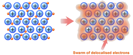 비편재화 된 전자는 방향족 탄화수소 뿐 아니라 고체 금속에서도 볼 수 있습니다. 금속결합을 이루는 전자는 금속 내부를 자유롭게 이동할 수있는 전자의 바다를 형성합니다. 금속의 전기전도도가 우수한 이유는 이런 비편재화된 전자 때문입니다.
